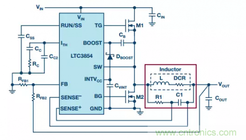 电路不直接测量电感电流,因此无法检测电感饱和。推荐使用软饱和的电感,如粉芯电感。与同等铁芯电感相比,此类电感的磁芯损耗通常较高。与RSENSE方法相比,电感DCR检测不存在检测电阻的功率损耗,但可能会增加电感的磁芯损耗。