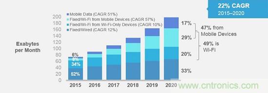 移动网络和Wi-Fi流量占有率比较。固定式/Wi-Fi流量自2018年起超越固定式/有线(wired)网络流量(来源:Cisco)