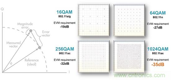 评估手机Wi-Fi发射信号质量的主要指针是误差向量幅度(EVM)。EVM反映了手机发射机信号IQ调变偏离理想值的程度。EVM越高,信号质量越差,再经过无线通道的衰减之后,路由器接收机就很难正常解调该信号,造成封包遗失和重传,从而延长了传输延迟。因此,我们期望在手机发射端的信号质量尽可能好,才能确保传输的稳定和低延迟。在手机生产制造过程中,我们使用VSA仪器对手机发射机发出的RF信号进行解调分析,即可计算出EVM值。