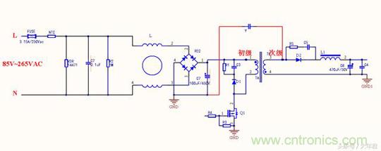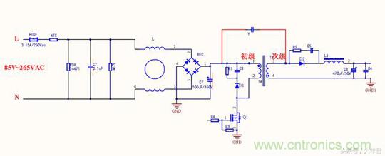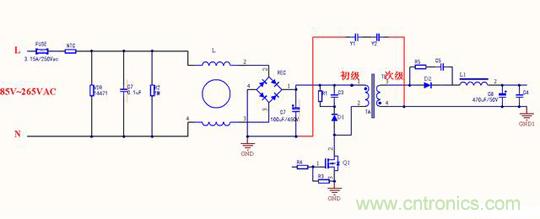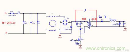 变压器的每个线圈绕组之间有寄生电容存在,在工作时过程当中形成电压,成为噪声源头,在初始高压与次级地之间跨接Y电容,能滤除初级和次级耦合产生的共模干扰,这与第一种差不多,只是在EMI测试时候结果会有所不同。