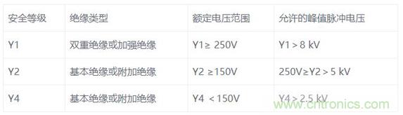 我们都知道Y电容是安规电容,是跨接L线地以及N线与地之间的电容,它的作用是抑制共模干扰。现在一共有三种等级,分别是是Y1, Y2, Y4。由于漏电流不能太大这是安规要求,漏电流太大人体触摸用电器会有一种麻麻的感觉,因此一般Y电容容量大小为1nF到4.7nF之间。