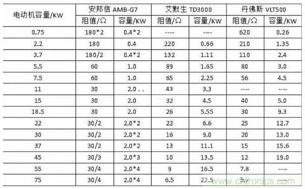 下图所示为部分变频器生产厂家提供的制动电阻的阻值与容量。