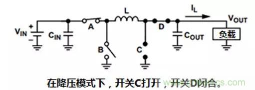 在降压模式下, 降压-升压转换器工作如下图,Vin大于Vout时,开关C打开,开关D闭合。