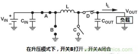 在升压模式下,Vin小于Vout 时,开关B打开,开关A闭合。这时,开关C和开关D的工作模式如下图表示。