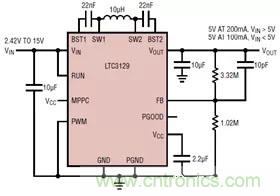 降压-升压转换器可以支持固定或可调的输出电压,也有可编程类型??杀喑汤嘈徒笛?升压转换器,如下图中的LTC3129,可通过外部分路电阻使输出电压达到应用的需要。