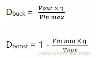 所以要计算降压模式的最小占空比和升压模式的最大占空比。这些占空比很重要,因为在这些占空比下,可以知道转换器工作范围的极限。占空比总是正数且小于1。