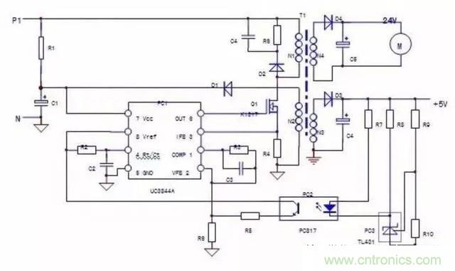 c.代换PC2,PC3无效,故障可能为开关管低效,或者UC3844内部输出电路低效,代换优质开关管或者UC3844芯片。