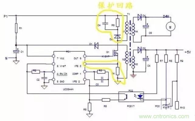 3)?;せ芈罚篜C1芯片本身和3脚外围元件R4构成过电流?;せ芈?N1绕组上并联的D2,R6,C4元件构成了开关管的反压吸收保护电路;实质上稳压回路的电压反馈信号——稳压信号,也可看作一路电压?;ば藕?,但保护电路的内容并不仅是局限于?;さ缏繁旧?,?;さ缏返钠艨赝怯捎诟涸氐缏芬斐K鸬?。
