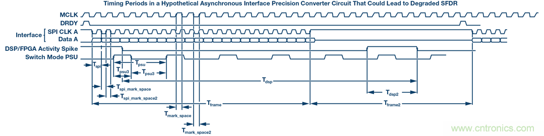 在图15中,标记了各种定时周期,这很容易干扰SFDR或导致抖动。如果SPI通信未频锁到MCLK,则可能发生杂散。掌握布局技术是您缓解此问题的最大保障。频率表现为混叠下行干扰源,但也作为拍频和交调产物。例如,如果SPI在16.01 MHz下运行,MCLK在16 MHz下运行,则应在10 kHz下发生杂散。