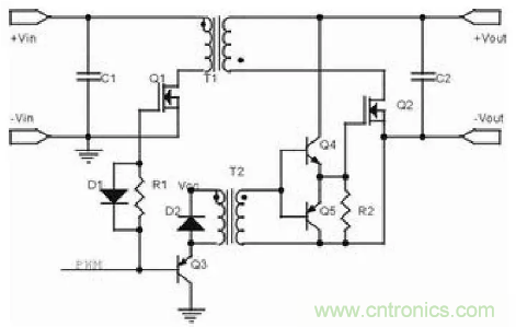 同步整流管的驱动方式有三种:第一种是外加驱动控制电路,优点是其驱动波形的质量高,调试方便。缺点是:电路复杂,成本高,在追求小型化和低成本的今天只有研究价值,基本没有应用价值。上图是简单的外驱电路,R1D1用于调整死区。该电路的驱动能力较小,在同步整流管的Ciss较小时,可以使用。图6是在图5的基础上增加副边推挽驱动电路的结构,可以驱动Ciss较大的MOSFET。在输出电压低于5V时,需要增加驱动电路供电电源。