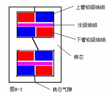 最后说一说绕组线圈的结构,因为胆机的后级都是用对管组成推挽电路的,为了防止由于两管负载不平衡所引铁芯起直流磁化,上下管的负载绕组不仅要做到电感一致,并且直流电阻也要一致,另外为了较少线间分布电容,在绕法上采取分层分边的绕法,如图B-2是音频输出变压器绕组的结构剖面图。这种绕组结构可使上下输出管的总电抗保持一致,从减少线间的分布电容的角度来看,层分得越多越细越好,从而使输出信号的频响特性得到较好的改善。