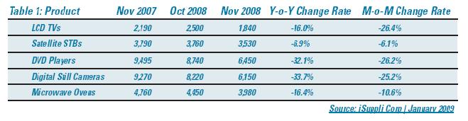 2008年11月,许多主要消费电子产品的出口量环比和同比双双下降,包括液晶电视、卫星机顶盒(STB)、DVD机、数码相机和微波炉。数码相机出口量的同比下降幅度最大,比2007年11月减少33.7%。液晶电视环比降幅最大,单位出货量比10月下滑26.4%。