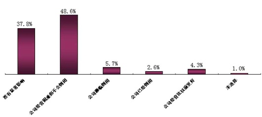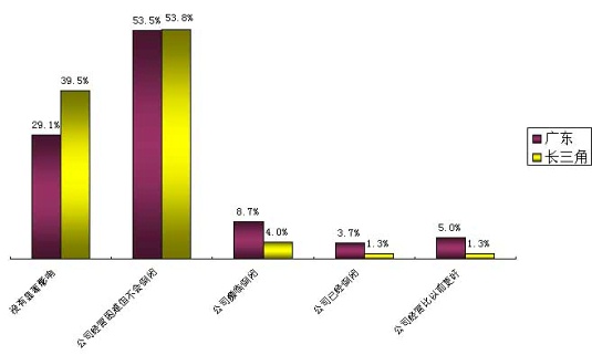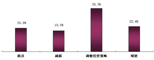 此项调查结果出乎我们的意料,选择裁员的企业已经占到了20.8%,但是多数企业还是选择了调整经营策略。我们特别希望有远见的企业不要把裁员作为应对危机的主要措施,这也不符合我们“和谐社会”的主旋律。只要能正确的面对,认真分析企业的优势,研究市场的动向,合理配置企业资源,充分发挥员工的潜力,调动员工的积极性,企业一定会有新的转机。企业如能和员工共克时艰,就会加深员工对企业的感情,这种情感会转化为企业的一种优势资源。(见图表四)