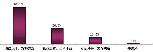 为了更深入了解电子工程师的生存环境,我们特意设置了这个问题。对每一位工程师来说,同事关系处理的如何,直接影响着他们的工作质量和生活质量,良好的同事关系,利人利己,利公利私。特别让我们欣慰的是,60.1%的电子工程师和同事处于团结互助,频繁交流的工作状态,在目前经济?;囊貊擦窒拢庋鹿叵迪缘挠任匾?。(见图表七)