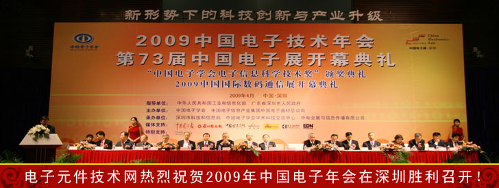 4月9日,“2009年中国电子技术年会”与“第73届中国电子展暨2009中国国际数码通信展”开幕式同时在会展中心隆重召开。本届年会由工业和信息化部、深圳市人民政府指导,中国电子学会、中国电子信息产业集团中国电子器材总公司主办,电子元件技术网(m.5r3h.cn)是活动特别支持网站,年会以“新形势下的科技创新与产业升级”为主题。原信息产业部部长、中国电子学会理事长吴基传,工业和信息化部副部长娄勤俭,工业和信息化部有关司局领导,深圳市、中国电子信息产业集团公司有关领导及多位院士、专家出席了会议。