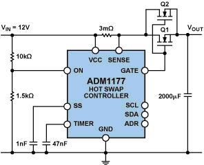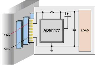 这个问题可通过热插拔控制器(图1)来解决,热插拔控制器能合理控制浪涌电流,确保安全上电间隔。上电后,热插拔控制器还能持续监控电源电流,在正常工作过程中避免短路和过流。