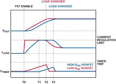 这个公式假定负载电流瞬时从0 A上升到30 A,这是一个理想情况。实际上,较大MOSFET的栅极电荷量QGS会限制栅极电压的压摆率,从而限制上电电流,因此,一定量的电荷会传输到负载电容而不触发定时器功能。在图4中,具有较大QGS的MOSFET会导致定时器的工作时间短于具有较小QGS的MOSFET,前者为T1 ~ T3,而后者为T0 ~ T2。[page]