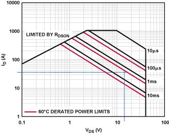 在40 V,降额后的功率所对应的电流为14 A,在SOA图上这点将确定新的62°C降额后的1 ms线。使用同样的办法可确定新的10 ms以及100 μs线。新线在图6中以红色示出。