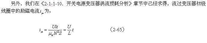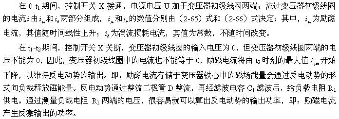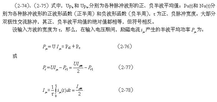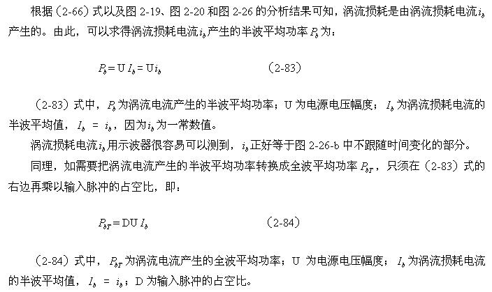顺便指出:(2-84)式的结果,是认为涡流损耗在t1-t2期间(图2-26-b)完全等于0而求得的,但实际上,在t1-t2期间变压器初级线圈产生的反电动势同样也会在变压器铁芯中感应产生涡流损耗电流,即当输入电压为0时刻,在变压器铁芯中还存在很短暂时间的涡流损耗;由于这种涡流损耗是由反电动势提供能量来维持的,它将随着反电动势能量的衰减很快就衰减到0。
