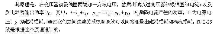 因此,(2-81)、(2-82)、(2-83)、(2-84)式最好只用于对正激式输出的单激式开关电源变压器进行磁滞损耗和涡流损耗功率测试,因为其初级线圈的电感相对比较大,励磁电流比较?。蝗绻枰苑醇な绞涑龅牡ゼな娇氐缭幢溲蛊鹘胁馐?,最好只用于对小功率开关电源进行对比测试。