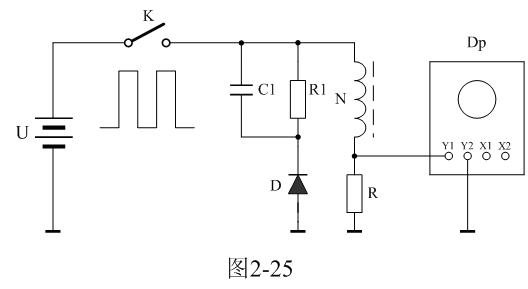图2-25中,U是电源电压,通过控制开关K不断地接通和关断,就可以把电源电压调制成单极性电压脉冲;N为变压器初级线圈,D为反激输出整流二极管;R1为反激输出负载电阻;C1为滤波电容;R为取样电阻,通过测量R两端的电压,就可以知道流过变压器初级线圈的电流;取样电压被送到示波器Dp进行显示。