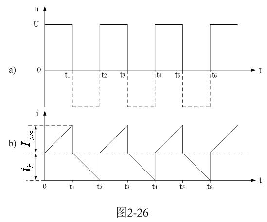 图2-26是图2-25电路中变压器初级线圈两端电压以及电流波形图。图2-25中,通过改变控制开关K的占空系数,可使变压器初级线圈正好工作于电流临界连续状态或电流断续状态,即:流过变压器初级线圈中的电流在下一次控制开关K接通之前为0。