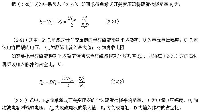 从(2-81)式和(2-82)式还很难看出,单激式开关电源变压器的磁滞损耗主要与谁相关,因为等式右边的减数和被减数与输入电压、脉冲宽度都有相同变化的趋向。实际上在脉冲宽度固定的情况下,单激式开关电源变压器的磁滞损耗是很小的,此结果在《开关电源变压器磁滞损耗分析》的章节中已经分析过。