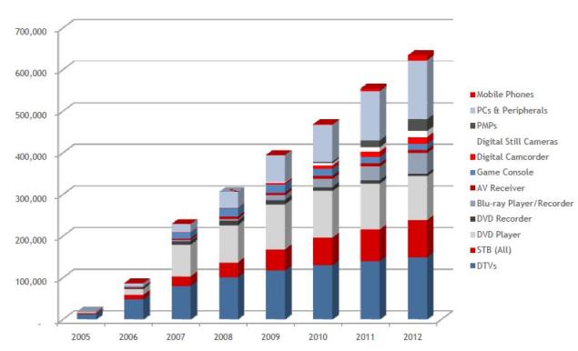 市场调查公司In-Stat的报告显示,在2009年发货的HDMI设备预计将达到约3.94亿台,此前销售的设备则已有10亿台。到2009年底,100%的数字彩电都将带有至少一个HDMI输入端。随之,2010年蓝光播放器,2012年DVD播放器都将实现HDMI接口的100%安装。见微知著,HDMI的应用前景和市场将极其广阔。