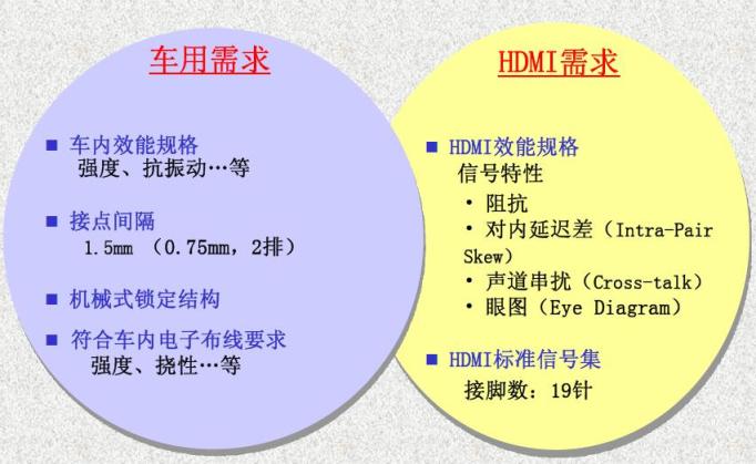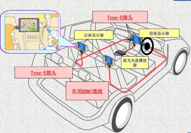 车用连接系统是专为车内高清内容传输所设计的布线规格。HDMI1.4规格所设计的解决方案,可处理车内布线所面临的高温、振动、噪音等各种问题与环境因素。车用连接系统是汽车生产商在设计车内高清内容传输时一个极有效的解决方案。