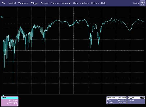 回波损耗或S11 是频域的测量和反射系数有关。归一化(通过反射平面校准 基线校正)反射系数的傅里叶变换给出了回波损耗是频率的函数。图2给出了USB 3.0线缆和连接器测量的结果。图中的横轴表示2GHz/div,范围是0~20GHz,纵轴表示10dB/div?;夭ㄋ鸷脑?GHz大约是15dB,但随着频率的增加开始变得越来越小。精细的空值间隔是由线缆末端的连接器引起的,较大的空值间隔是由于连接器内部的阻抗结构决定的。