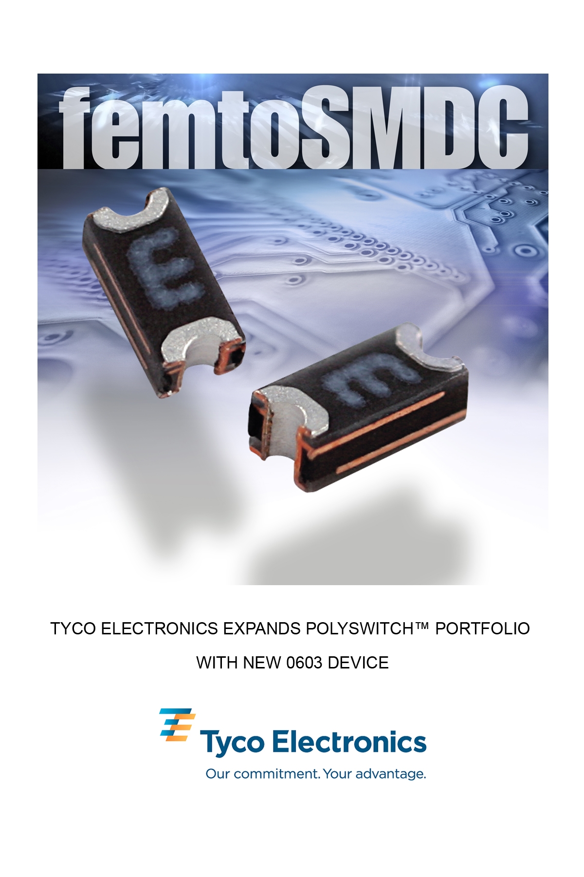 泰科电子(Tyco Electronics)今天宣布其广受欢迎的表面贴装PolySwitch™器件系列再添一款符合行业标准的新型0603器件。femtoSMDC016F器件的占板面积不到上一代器件的一半,并且有助于?;っ舾械缱拥缏访馐芄骷肮率鹿实乃鸹?。该器件的快速动作时间和可复位功能可帮助制造商降低保修费用和提高各种便携式电子产品的可靠性,比如以下产品: