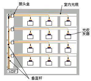 总配线架(MDF)安装在大楼内的公共地区,光缆通过垂直的杆状物通向各楼层,再通过水平方向上的管道进入房间。