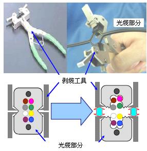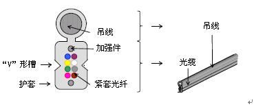 这种缆采用PVC紧套光纤,金属吊线,PVC或LSZH做阻燃护套层,适合于室内布线使用,性能稳定可靠;采用小弯曲半径光纤生产,具有优良的抗弯性能;阻燃;施工方便可靠??梢匝∮米诺墓ぞ呓邪?,从光缆“V”形槽区域剥开,获得紧套光纤,操作简单。如图3所示。