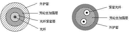 单芯光缆直径在2.8mm,而双芯光缆直径约4.2mm。两者都采用900um的半紧套缓冲光纤,这种半紧套结构能保证在不到1分钟的时间内轻易地剥离取得1m以上的光纤,操作很方便。并且都采用弯曲性能极好的光纤,弯曲柔韧性好。在1550nm波长