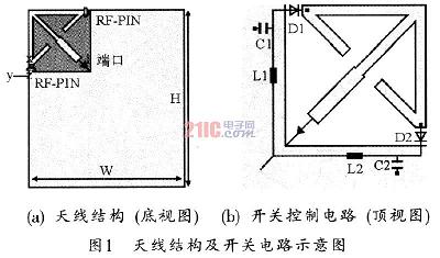 天线可以与手持设备电路板集成在一起,安装在电路板的左上角,其结构和RF-PIN开关控制电路示意图如图1所示。