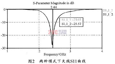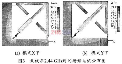 [page]由于两种工作状态下,天线的接地端不同,因此,天线的有效辐射部分也有所不同。当处于X模式时,天线结构中垂直部分的微带线接地,因此,天线的辐射部分应该为水平部分的微带,天线也相应工作在水平极化方式。图3所示为天线在2.44GHz时的射频电流分布图。