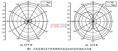 从图3可以看出,射频电流主要集中在天线水平方向的微带线上(这印证了前面的分析)。但同时,在中间部分的微带以及天线其他部分也存在射频电流,因此,天线仍会辐射部分垂直极化波。图4所示为天线的两种极化波在XY及YZ平面的方向图。