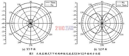 当处于Y模式下时,天线结构中水平部分的微带线接地,因此,垂直部分的微带线是天线的有效辐射体,此时天线也相应工作在垂直极化方式下。图3(b)所示为模式Y下天线在2.4GHz的射频电流分布图,从图中可以看出,此时的射频电流主要集中在天线垂直方向的微带线上,天线此时工作在垂直极化方式下。图5所示为该模式下天线两种极化波在XY和YZ平面的方向图。