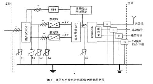 图为我局通信机房雷电过电压?;づ渲檬疽馔?,其中S1为DEHNventil 280/4型电源1、2级复合防雷器,S2为DEHNguard T385型电源2级防雷器,S3为DEHNrail 48FML型电源3级防雷器(直流48 V),A为UGK/N(2.5 G)天馈线防雷器,B为YG20-A音频隔离变压器,C为ZH型中和变压器,D为同轴防雷器。