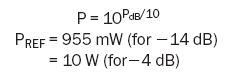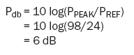 当D类放大器的工作电压为14V时,可出现98W的峰值。转换为分贝是:
