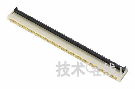 此制品以间距0.3mm、高1.1mm、进深4.3mm(滑片锁上时)尺寸,制成了90引脚的多极连接器。合适的FPC厚度为0.2mm。因采用上下配备接点的构造,设计时可无需考虑插入的FPC接点方向。