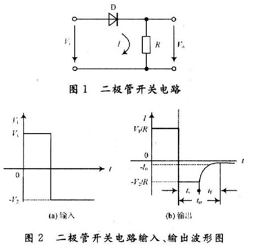 [page]如图1所示,输入端施加一脉冲信号Vi,其幅值为+V1和-V2。当加在二极管两端的电压为+V1,二极管导通;当加在二极管两端的电压为-V2,二极管截止,输入、输出波形如图2所示。二极管两端的电压由正向偏置+V1变为反向偏置-V2时,二极管并不瞬时截止,而是维持一段时间ts后,电流才开始减小,再经tf后,反向电流才等于静态特性上的反向漂移电流I0,其值很小。ts称为存贮时间,tf称为下降时间,ts+tf=trr称为关断时间。二极管两端的电压由反向偏置-V2变为正向偏置+V1时,二极管也不是瞬时导通,而是经过导通延迟时间和上升时间后才稳定导通,这段时间称为开通时间。显然二极管的导通和截止时刻总是滞后加于其两端高、低电平的时刻。二极管从截止转为正向导通的开通时间,与从导通转向截止时的关断时间相比很小,其对开关速度的影响很小,在分析讨论中主要考虑关断时间的影响。