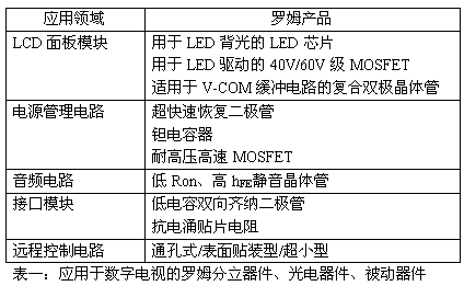 除了半导体IC,罗姆公司的分立和被动元件产品,也可以在数字电视的LCD面板???、电源管理电路、音频电路、接口模块、远程控制电路等领域有广泛的应用。