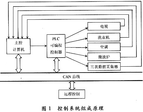 家庭智能控制系统的主要功能集中在家庭安全报警、电话或电脑远程控制、红外???、自动抄表控制、灯光和湿度控制等方面。根据智能终端设备传输数据和功能的不同可以把它分成两类子网,一类是传输数据以数据量小、速率低的家庭自动化控制设备;另一类是传输多媒体信息、(视频、音频信号),信号量大、速率快,如视频会议、音频点播等。家庭智能终端设备可以采用总线结构组建成有线子网和无线子网,因各设备分布在家中不同的地方,对于组建成有线子网布线比较复杂,但是如果采用PLC与CAN总线构建成网络,将降低成本。