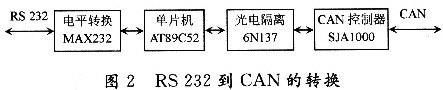 RS232串口的帧格式为:1位起始位,8位数据位,1位可编程的第9位(此位为发送和接收的地址/数据位),1位停止位。而CAN的数据帧格式为:帧信息+ID+数据(可分为标准帧和扩展帧两种格式)。因此,设计时就需要有一个微控制器来实现电平和帧格式等的转换,其转换方式如图2所示。