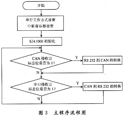 在微处理控制下,RS232和CAN进行数据交换时,采用串口接收和CAN中断方式可提高工作效率。SJAl000的初始化在复位模式下才可以进行,主要包括工作方式的设置、时钟分频和验收滤波寄存器的设置、波特率参数的设置以及中断允许寄存器的设置等。其主程序流程图如图3所示。