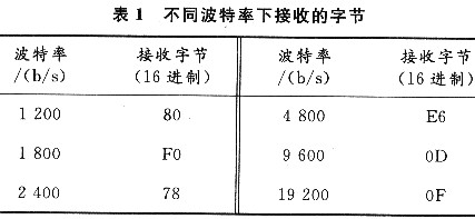 检测转换装置的串口波特率,首先可对主机的接收波特率(以9600b/s为例)进行设定,并在终端发送一个特定的字符(以回车符为例),这样,主机根据接收到的字符信息就可以确定转换装置的通信波特率?;爻捣腁SCII值是0DH,在不同波特率下接收到的值如表1所列。[page]