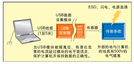 图2:未隔离的USB数据采集??樵贓SD、闪电、电源浪涌的时候可能损害系统并导致数据不正确。