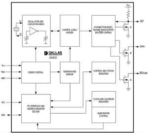 本节将以Maxim公司的DS32kHz温补晶体振荡器为例,介绍通过改变晶体负载电容修正由于温度变化产生的频偏的概念,如图2所示,Maxim的这项内部校准技术还获得了专利。DS32kHz可以作为大多数系统的32kHz输入,如RTC或内置RTC的微控制器。