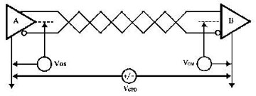 • 共模干扰问题。的确,RS-485接口采用差分方式传输信号,并不需要相对于某个参照点来检测信号,系统只需检测两线之间的电位差就可以了。但应该注意的是,收发器只有在共模电压不超出一定范围(-7V至+12V)的条件下才能正常工作。当共模电压超出此范围就会影响通信的可靠,直至损坏接口。如图3所示,当发送器A向接收器B发送数据时,发送器A的输出共模电压为VOS,由于两个系统具有各自独立的接地系统,存在着地电位差VGPD。那么,接收器输入端的共模电压就会达到VCM=VOS+VGPD。RS-485标准规定VOS≤3V,但VGPD可能会有很大幅度(十几伏甚至数十伏),并可能伴有强干扰信号,致使接收器共模输入VCM超出正常范围,并在信号线上产生干扰电流,轻则影响正常通信,重则损坏接口。